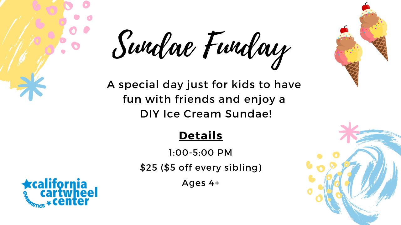 Back to All Events Sundae Funday - July Sunday, July 10, 2022 1:00 PM 5:00 PM California Cartwheel Center 1111 Rancho Conejo Blvd. NEWBURY PARK United States (map) Google Calendar ICS